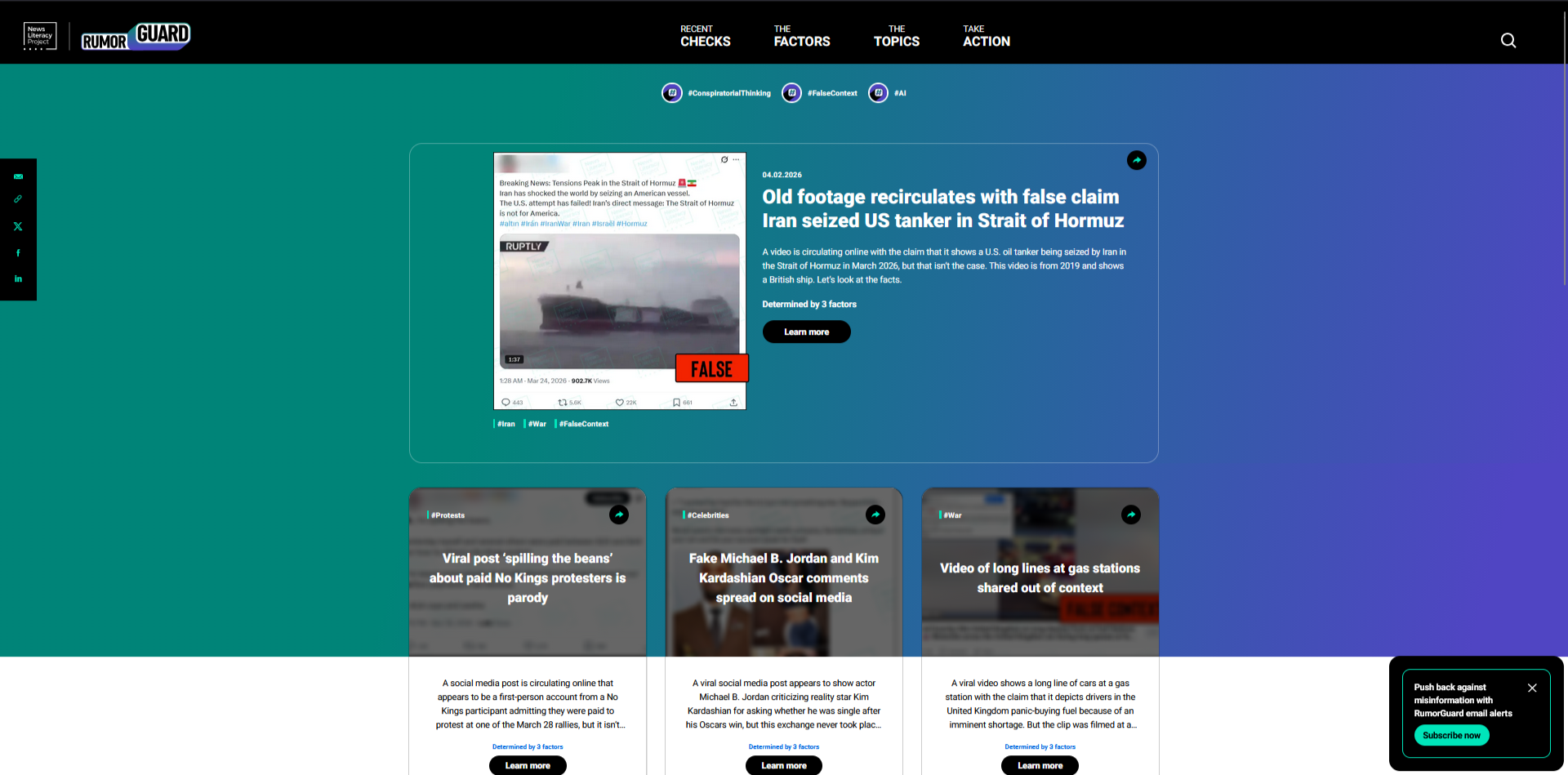 The first website I looked over was the News Literacy Project’s “Rumor Guard.” This website provides educational resources and additional information on how to spot and assess misinformation from around social media and the internet as a whole. Its main feature is presenting news and social media posts that seem real and provides context and additional information on how it is fake.