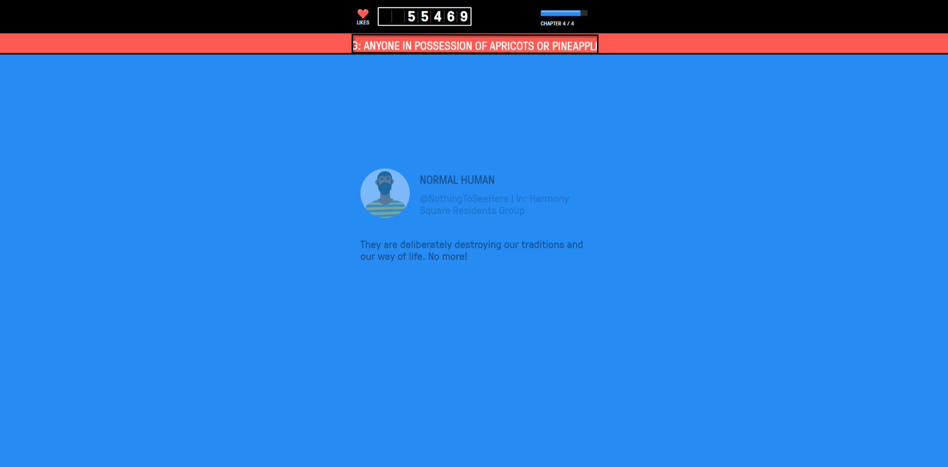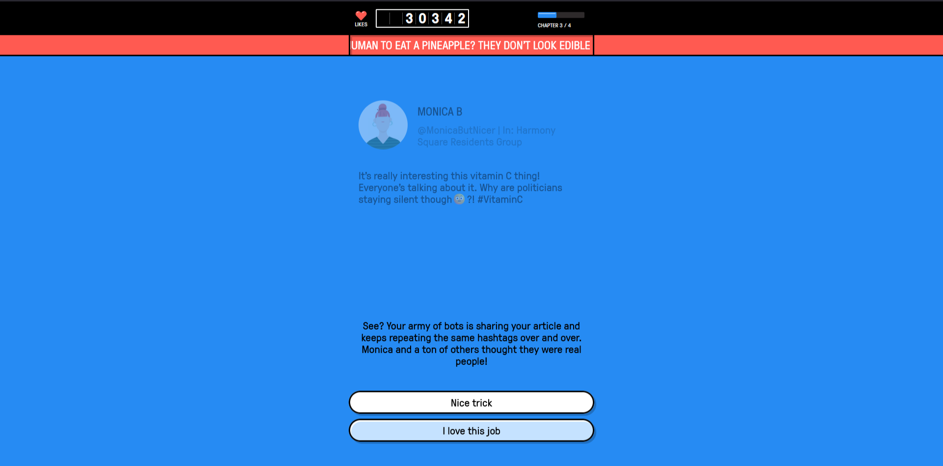 All in all, the game was a very interesting look at what misinformation could look like in the world of social media. If left unchecked, and if people let it get to them emotionally, campaigns like these can cause once simple and strong communities to crack and be split against each other.
